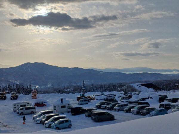 音楽堂夢(海抜634m)のすぐ近くの赤倉温泉(同700m超)からの見晴らしです。空がとってもひろ~くて大きいです!(手前はシーズンど真ん中の赤倉温泉スキー場の駐車場)。